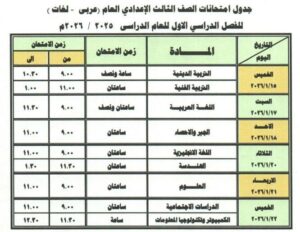 جدول امتحانات الشهادة الاعدادية 2026 الترم الاول دمياط